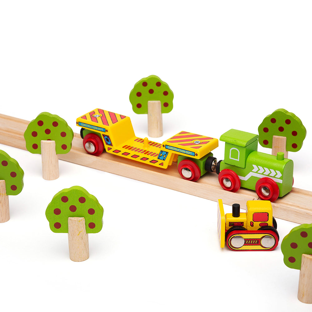 The detachable bulldozer sits securely on board and lets the wooden railway network take the strain! Pair with our Construction Train Set for lots of imaginative building site fun.