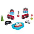 Time to get busy and add some extra traffic to your track layout! A black taxi cab, red double decker bus, fire engine, police car and a boat make up this fleet of city vehicles. Endless hours of creative role play fun.