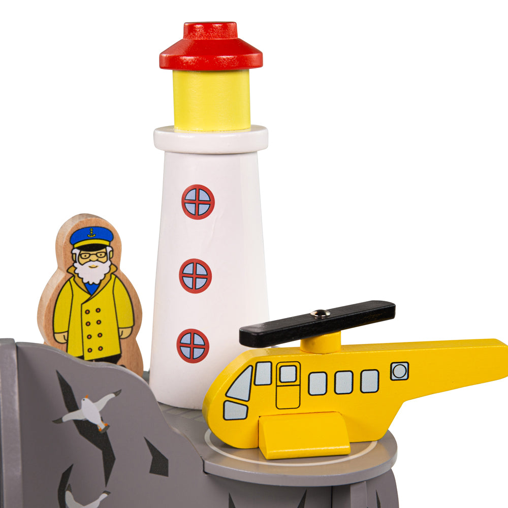Compatible with Bigjigs Rail wooden train sets, use this lighthouse wooden train accessory for the toy train to pass under to safely get to the other side. Mini train enthusiasts can set up their own sea search and rescue mission with the helicopter and wooden railway network on hand to help.