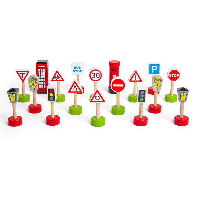 The Bigjigs Road Signs Pack contains lots of wooden roadside accessories to complete your network, including ten road signs, two traffic lights, two parking meters, a classic red post box and a telephone box. There's even two authentic looking streetlamps to place in busy areas! Consists of 18 play pieces.