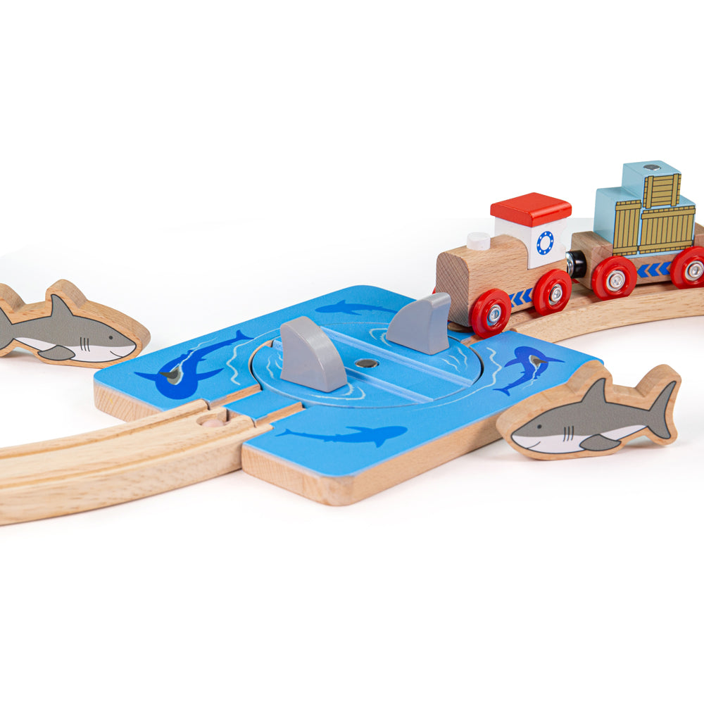 Watch out for the sharks! Our Shark Attack Wooden Train Track is a 'Jaws'-dropping addition to any wooden train set. Halt the train when the shark fins are blocking the way and twist the turntable before continuing the journey over the shark-infested waters.