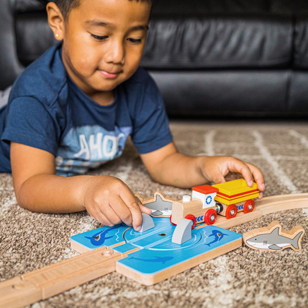 Also comes with two wooden shark figurines to add to the sealife fun. An exciting way to develop creativity, fine motor skills and hand/eye coordination as little hands arrange their dream wooden railway network.