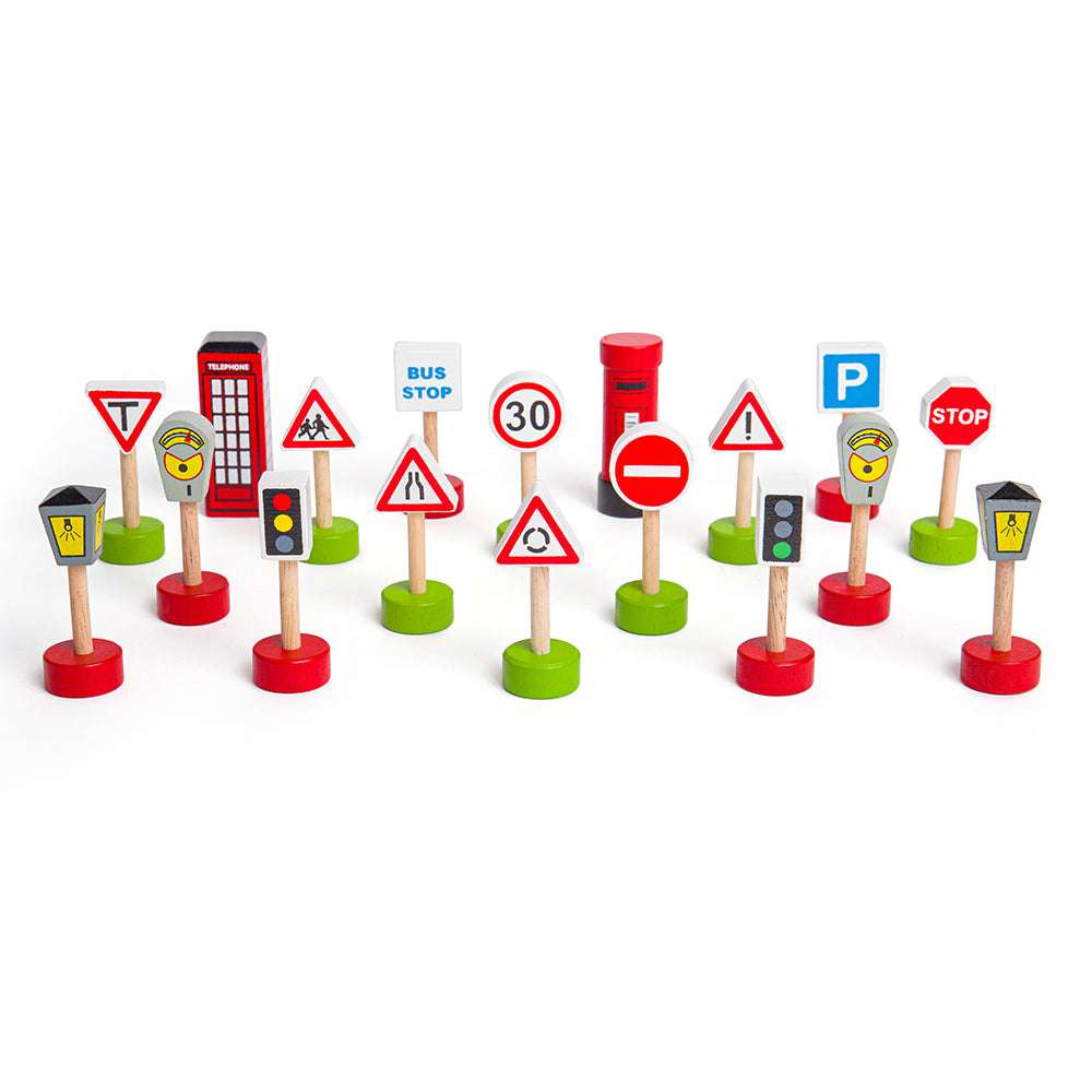 The Bigjigs Road Signs Pack contains lots of wooden roadside accessories to complete your network, including ten road signs, two traffic lights, two parking meters, a classic red post box and a telephone box. There's even two authentic looking streetlamps to place in busy areas! Consists of 18 play pieces.